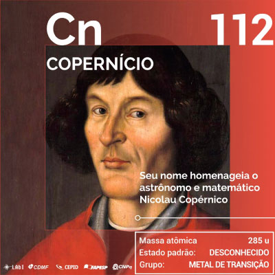 Mais um dos elementos produzidos pela primeira vez no Laboratório de Pesquisa de Íons Pesados (GSI), na Alemanha, em 1996. Depois de uma semana bombardeando um alvo de chumbo com átomos de zinco em um acelerador de partículas, um único átomo foi produzido. Um segundo átomo foi produzido no próprio GSI no ano 2000 e dois outros no Japão em 2004, levando ao reconhecimento do elemento. O nome oficial foi reconhecido em 2010, homenageando o astrônomo e matemático Nicolau Copérnico, autor da teoria heliocêntrica que iniciaria o período de cerca de 150 anos conhecido como “revolução copernicana”, revolução científica marcada pelos trabalhos de Galileu Galilei, Johannes Kepler e Isaac Newton.